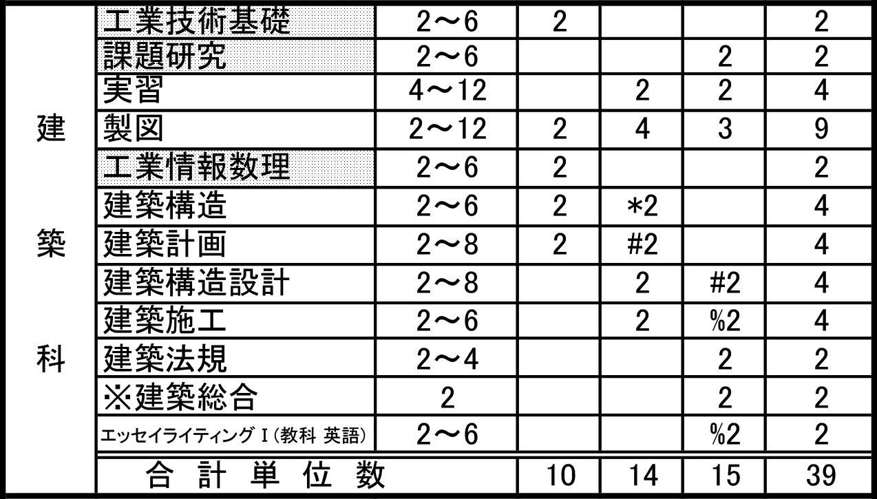 注2 #・*・%・¥印は共通科目と専門科目の選択で、単位数は専門科目に算入している。教科英語「エッセイライティングⅠ」の単位数は専門科目の%印の科目に算入。