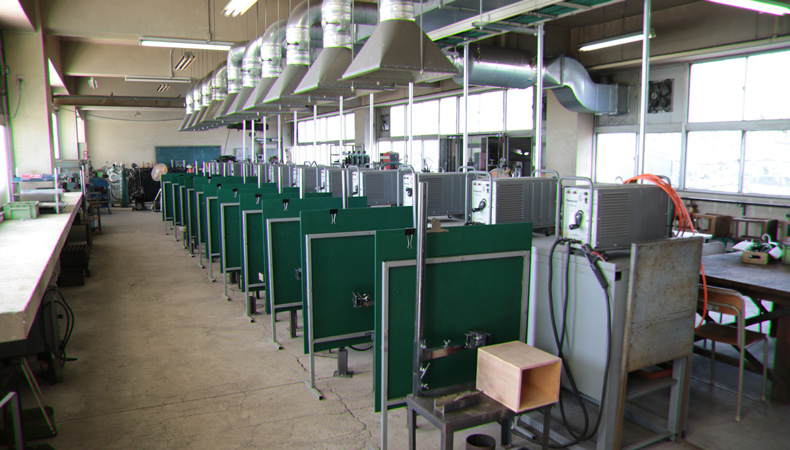 板金溶接実習室 ガス・電気の熱エネルギーを利用し金属を接合する実習を行っています。