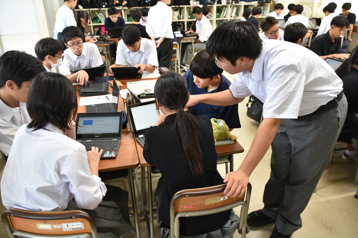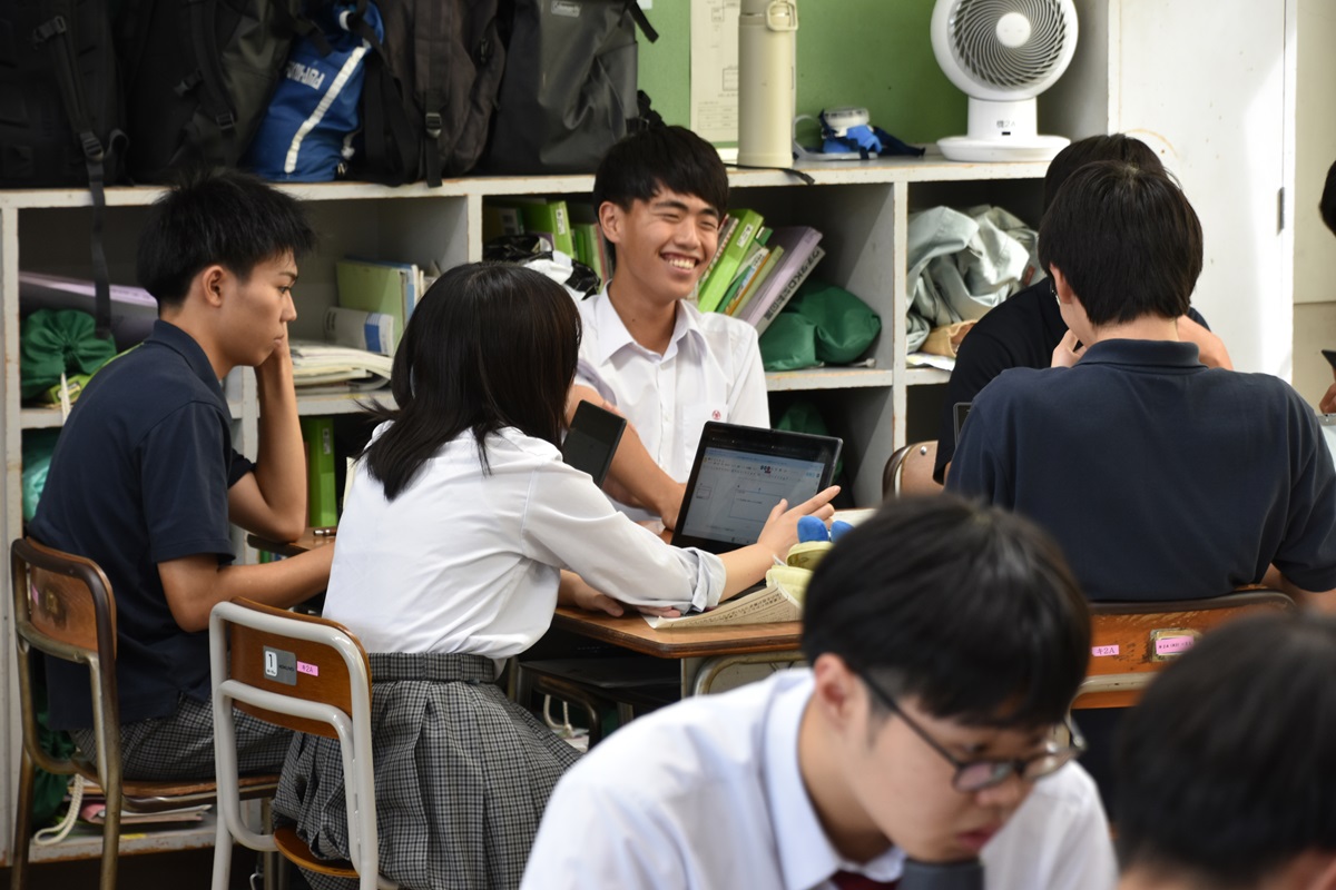 生徒も先生も初めての試みのため、授業が始まる前には(チャイムが鳴ると同時にスタートできるかな?)と不安が頭をよぎりました。しかし、チャイムが鳴る前には自分が割り当てられたクラスへ移動し、一斉にスタートすることができました。いいね!