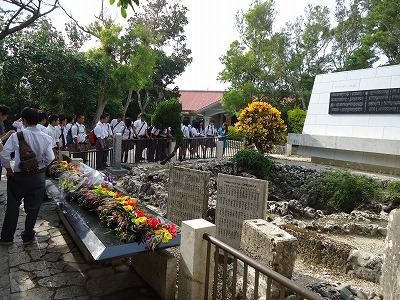 「台風の余波で強い風が時折吹くことがありますが,第1日目の沖縄への飛行機体験,ひめゆりの塔とひめゆり平和祈念資料館の見学,平和祈念公園の見学の平和学習を全員無事終えて,宿舎に到着いたしました。」「添付の写真はひめゆりの塔のガイドを視聴と平和祈念公園のガイド視聴の写真です。」
