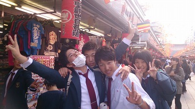 「浅草散策です。初日の天気が嘘のような良い天気です。残念ながら雷門は修理中のようでした。みんな最後のお土産ポイントで買い物を楽しんだり、おみくじをひいたり楽しんでいました。」