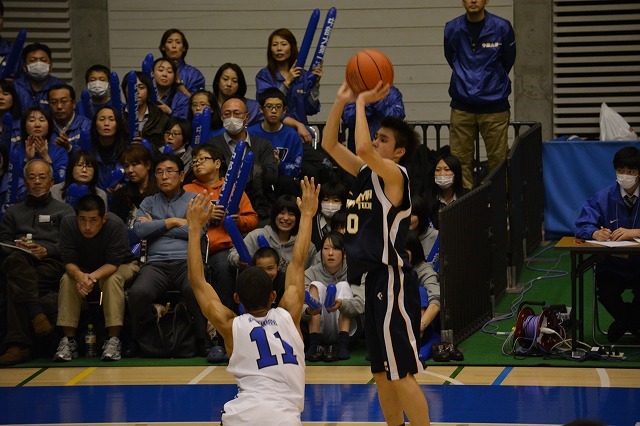 1Qは連続得点を許し、17-24と先行されました。2Qは岡工の持ち味である粘り強いディフェンスからの速い攻めが決まり、一時逆転しました。その後互角の展開となり、34-38で前半を終えました。3Q立ち上がり、岡工のペースで同点に追いついたものの、中部第一の長身選手に得点を重ねられ、さらに速攻を許すなど一気に差をつけられて48-60で終了。4Qは一進一退の攻防となりましたが、終盤またも相手ペースとなって69-89で試合終了。最後まであきらめず健闘しましたが、一歩及びませんでした。