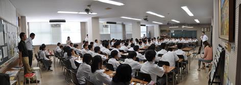 6月10日6校時に,平成12年度卒 (株)山陽設計の野上直紀氏と平成25年度卒 名古屋工業大学2年生小野圭織さん,2人の先輩から後輩に向けての講演をしていただきました。野上氏からは,働くことの楽しさ。建築の仕事に対する姿勢など,小野さんからは大学での授業の内容や,高校時代のよかったことなど。短い時間でしたが生徒達にとって,貴重な内容だったと思います。