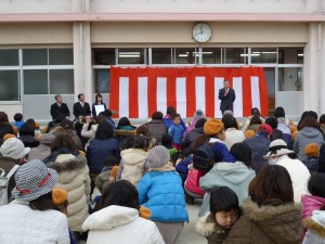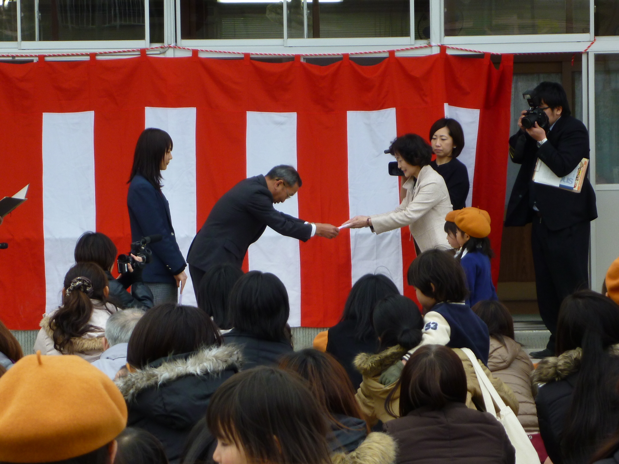贈呈式は11時40分に始まりました。本校校長と伊島幼稚園々長の、いきさつやお礼を込めたあいさつ、目録とミニプレートの贈呈、園児代表からの花束贈呈があり、その後、制作者のデザイン科3年 大前 さんが、「園児の皆さんがよい子に育ってくれるよう、心を込めて作りました」というあいさつを述べ、園児全員による元気なお礼のことばが送られました。