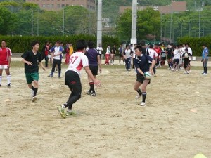4月30日(土)の10時半から、岡山大学グラウンド(岡山市津島)において、本校ラグビー部の、新入生を含む23名が、岡山大学(スポーツ教育センター)とコカコーラウエストジャパン【Red Sparks】(トップリーグ所属)企画の、『ラグビー・クリニック2011』に参加させていただきました。