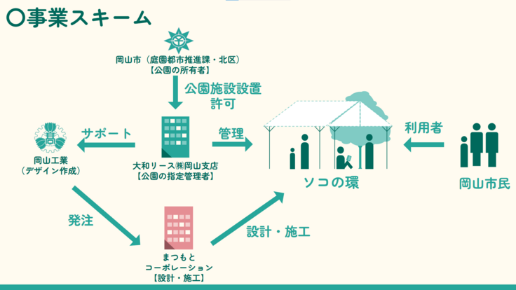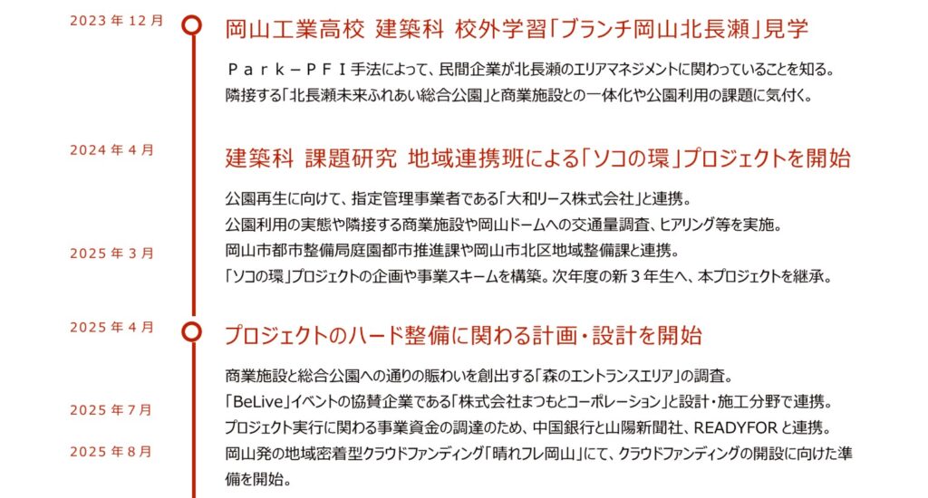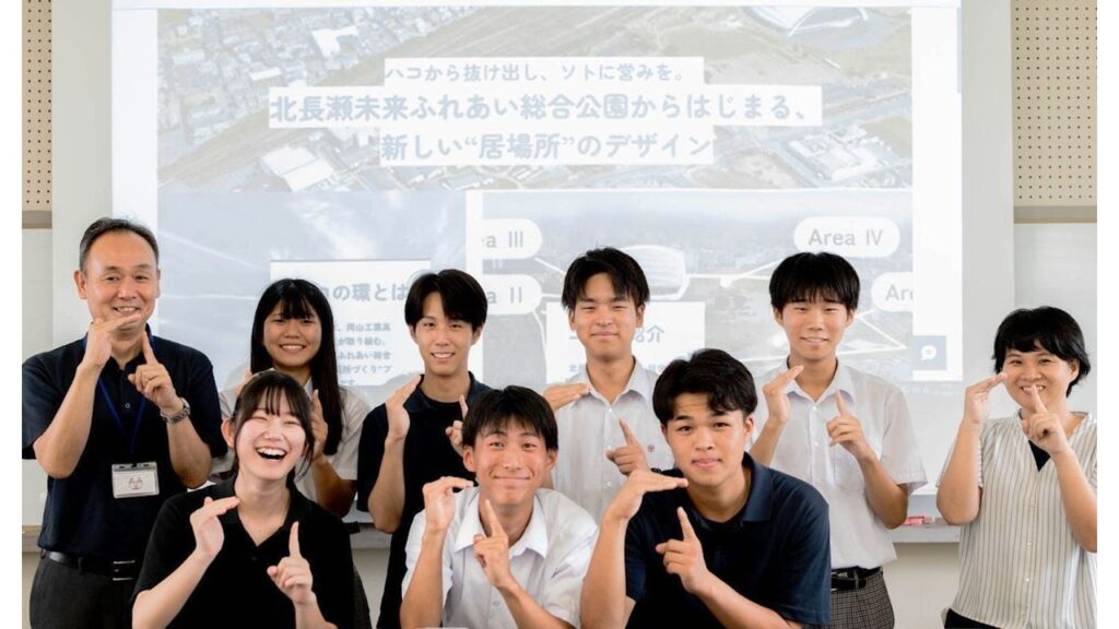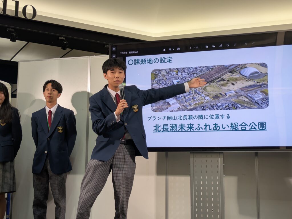 生徒たちは毎年本校で実施している秋季校外学習で訪れた北長瀬エリアの見学を通じて、ブランチ岡山北長瀬(屋外型商業施設)と北長瀬未来ふれあい総合公園とのつながりをより良くし、北長瀬エリアが一体となった賑わいの創出について取り組みたいとの思いでスタートしたプロジェクトです。
