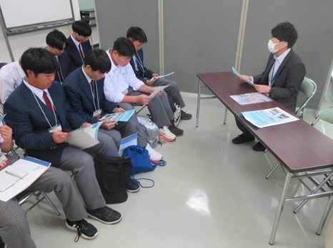 8時に学校をバスで出発し、10時過ぎに会場である広島産業会館東館へ到着。まず学生交流広場プログラムとして5班に分かれ、各班2社ずつ企業説明をして頂きました。何社かは本校の卒業生が在籍している会社でした。