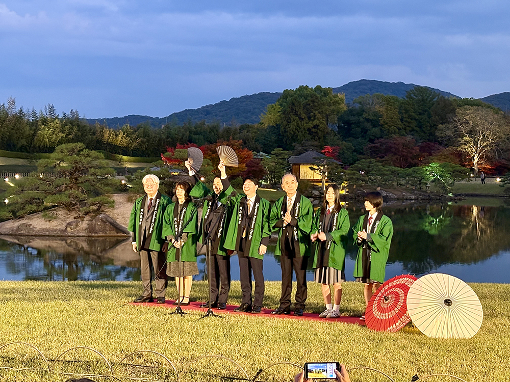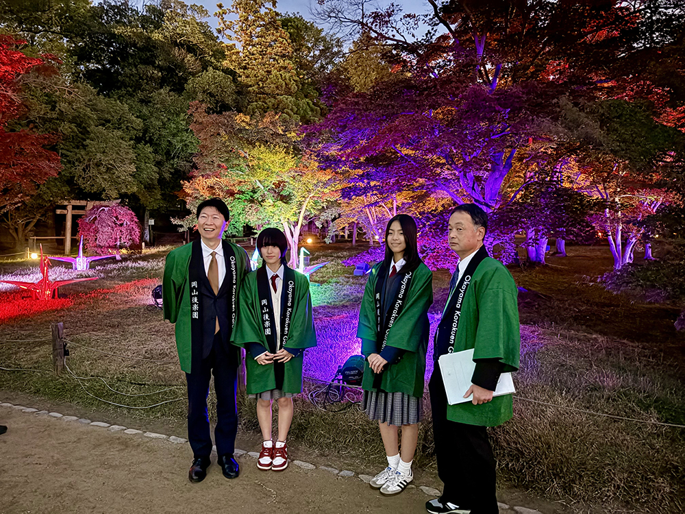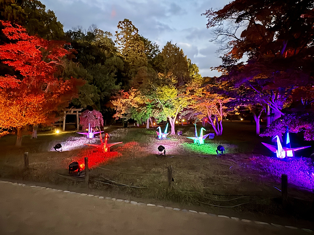 11月14日(金)の17時から点灯セレモニーが行われ、今回の企画に参加した松原さんとデザイン2年 野﨑 咲良さんが出席しました。日が落ちて、伊原木県知事の扇子の合図で後楽園全体に照明が点ると一層幻想的な雰囲気に包まれました。折り鶴ランプは、後楽園の一番奥にある「千入(ちしお)の森」という紅葉のきれいなスポットに展示されています。岡山後楽園・秋の幻想庭園は、11月24日(月・祝)まで開催されていますので、ぜひ足を運んでいただき、実際にご覧ください。