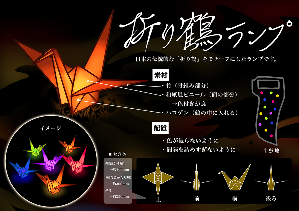 岡山後楽園・秋の幻想庭園にデザイン科2年 松原 千畝さんの考えたデザインが展示されています。この企画は、6月に岡山後楽園事務所から「高校生に幻想庭園のアイデアを考えてほしい」という依頼を受け、デザイン科有志で夏休みに取り組みました。いくつかアイデアを出した中で、松原さんの折り鶴をモチーフにしたデザインが採用され、今回の展示となりました。