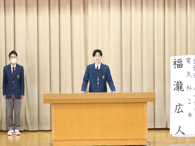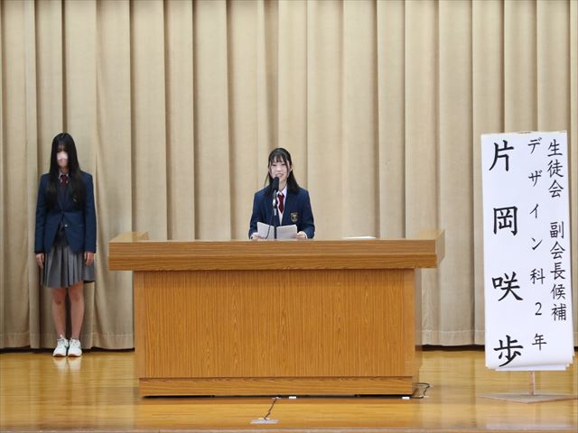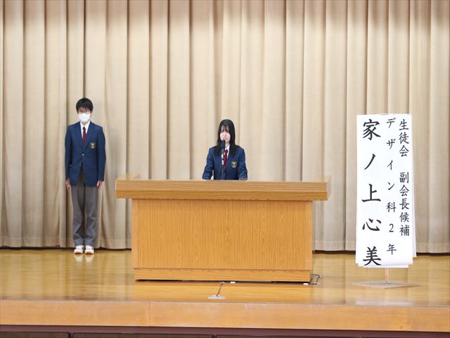 次期生徒会長には電気科2年生 福瀧 広人君、副会長にはデザイン科2年生 家ノ上 心美さん、デザイン科2年生 片岡 咲歩さんに決まりました。これからの岡山工業高校の先頭に立ち、よりよい学校づくりをしてくれたらと期待をしています。
