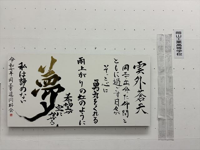 令和7年11月18日(火)~23日(日)に開催された岡山県高校生書道展覧会にて作品を展示しました。部員10名で書いた合作を、多くの皆様にご覧いただきました。ありがとうございました。17日(月)の搬入日には部員6名が参加し、他の高校の書道部員と交流をしたり、力作を鑑賞したりして過ごし、たくさんの刺激を受けた日になったようです!