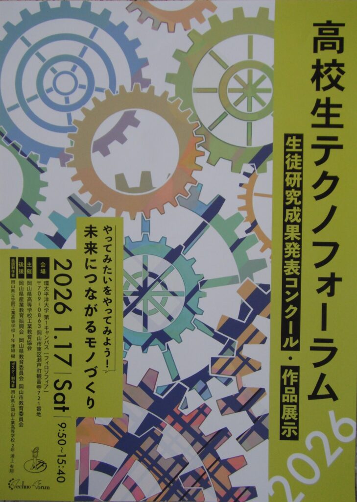 県内工業高校の研究発表大会である岡山県高等学校工業教育協会主催「2026高校生テクノフォーラム」が1月17日(土)に環太平洋大学にて行われ、5校7チームが発表し、本校からは土木科と化学工学科が参加しました。 また、ポスター部門にデザイン科が応募しました。
