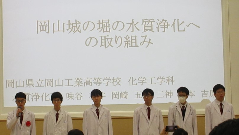 化学工学科の発表「岡山城の堀の水質浄化活動」(研究者:3年 味谷祐杜、石井翼、岡﨑太一、五島白弥、二神敬太、宮本太志、吉原匠※発表者は6名)は、7年前から研究して水酸化マグネシウムを用いて堀の浄化に取り組み、更なる改善にはどうするか研究したことについてを発表しました。
