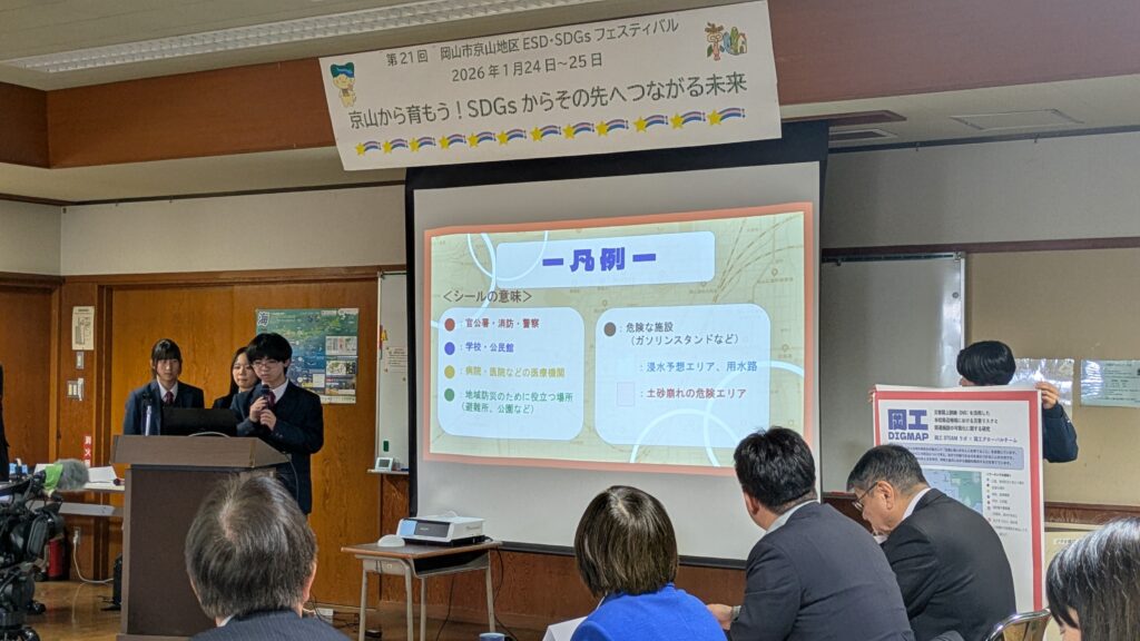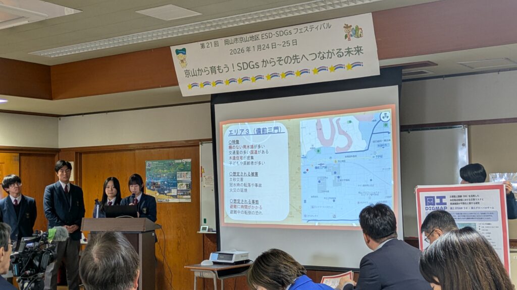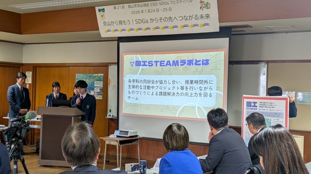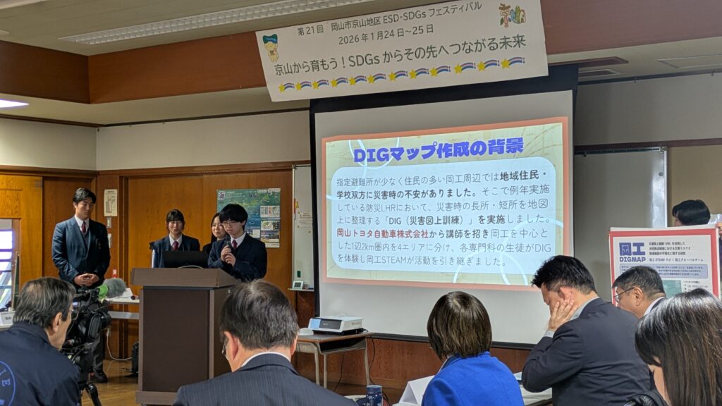 1月24日(土)に令和7年度京山地区ESD・SDGsフェスティバルが開催され、本校からは「岡工STEAMラボ」が今年度取り組んだDIGマップガイドブックの作成に関する成果報告を行いました。