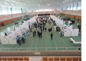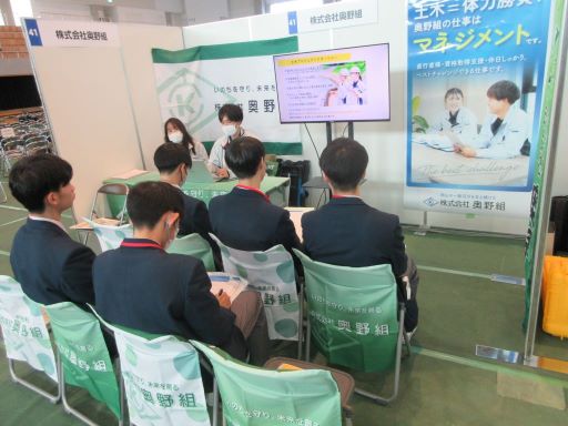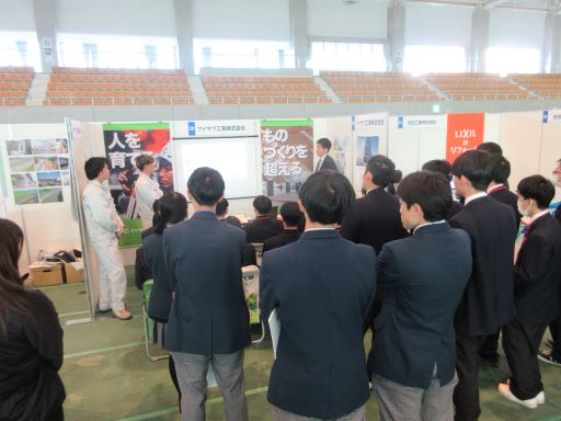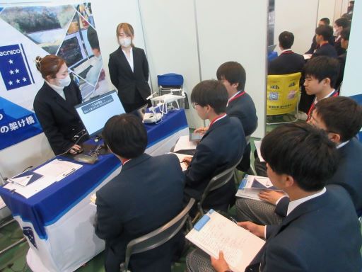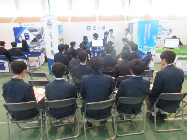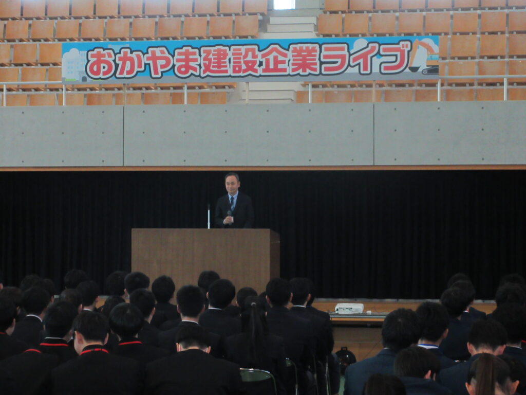 令和8年1月15日、シゲトーアリーナにて「おかやま建設企業ライブ」が開催され、土木科・建築科の2年生が参加しました。この催しはキャリア教育の一環として、岡山県内高等学校の土木・建築系学科に在籍する生徒を対象に、建設産業の魅力や現状を伝える企業情報説明会です。全部で約300人の生徒が集まりました。岡山県高等学校工業教育協会会長(本校校長)河本裕次郎先生の挨拶で開会しました。生徒は皆、建設産業を知る数少ない機会ということで、一生懸命説明を聞いていました。何社かは岡山工業高校の先輩が説明担当をしていました。先輩と聞いて、驚いていましたが、尊敬のまなざしで説明を聞いていました。何年か後には、ここに参加した生徒のうち何人かが企業説明をしているかもしれませんね。