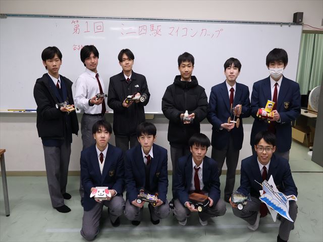 本日、マイコン同会の活動で「第一回 自作ミニ四駆 マイコンカップ」が開催されました。生徒たちがデザイン賞と最速賞を目指して自作ミニ四駆を作成しました。レギュレーションも曖昧な状態で出場する生徒たちがルール等を決めながら大会を行い、とても盛り上がっていました。来年も是非やりたいという生徒が多数いるのでぜひ第2回を開催しようと思います。