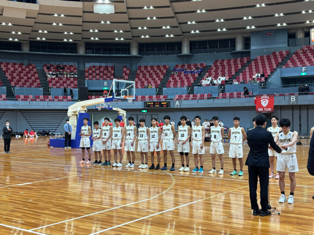 中国地方の強豪チームを相手に自分たちの力を発揮できるよう準備して大会に臨みました。1,2回戦ではサイズでは相手に劣りますが、粘り強くチーム一丸で戦い抜き、準決勝に進むことができました。準決勝の相手は昨年のインターハイで優勝した鳥取城北と対戦し、全国区のチームに力の差を見せつけられましたが、大きな舞台で全国の強豪相手に果敢に挑み、貴重な経験をすることができました。今シーズンのスローガンは『Clamore Vincimus』であり、そのスローガンの通り選手や多くの保護者の方の声援を背に勝利を目指し岡工らしい姿で戦いました。