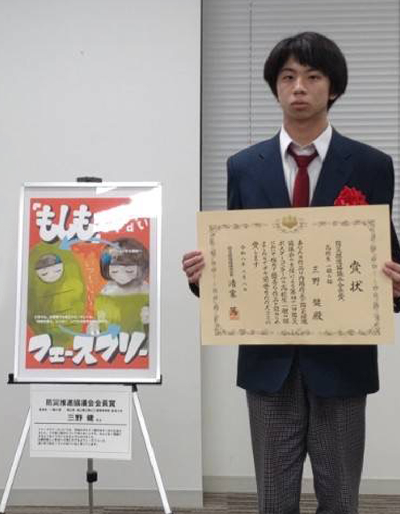 第41回防災ポスターコンクール(主催:内閣府、防災推進協議会)に応募したところ、デザイン科2年三野健くんの作品が高校生・一般の部の「防災推進協議会会長賞」に入賞しました。また、佳作としてデザイン科2年清水柑奈さんの作品が選ばれました。入賞した三野くんは2月8日に東京都の霞ヶ関で行われた表彰式に参加してきました。