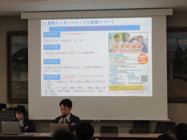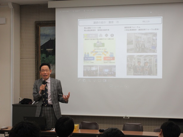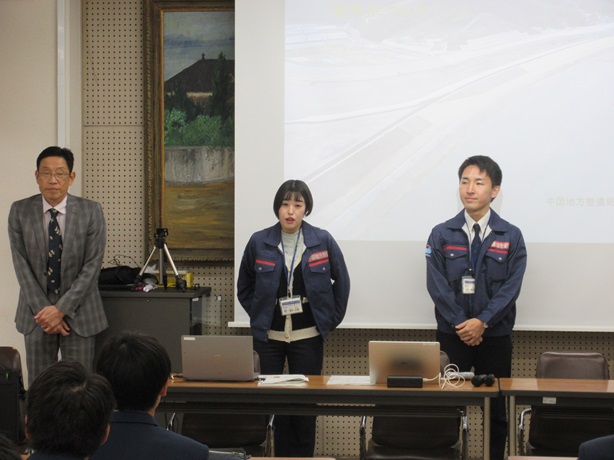 令和8年2月19日(木)、土木科1・2年生を対象に、「土木×防災教育×キャリア講演会」を行いました。講師の先生方は、国土交通省中国地方整備局岡山河川事務所より福井様・尾方様と、常盤工業株式会社広島支店藤原様にお越しいただきました。