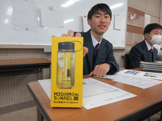 続いて、常盤工業の藤原様からは、ご自身のキャリアの中で携わった災害に関するお話しや、それをもとに防災に関してどのように土木が関係づけられるかなどのお話を聞きました。さらに手動充電器や防災備蓄ボトルなどの実物も持参いただき、生徒は手に取って拝見させていただきました。
