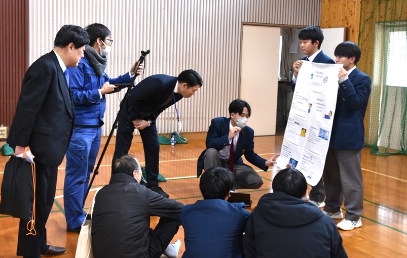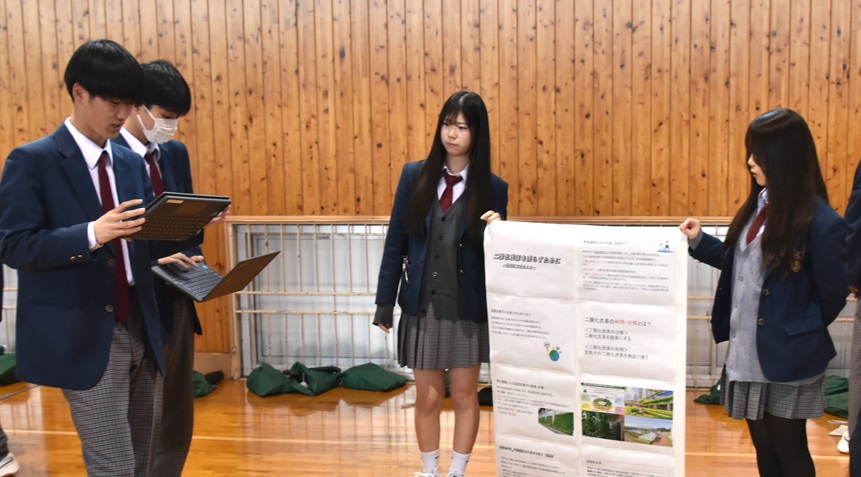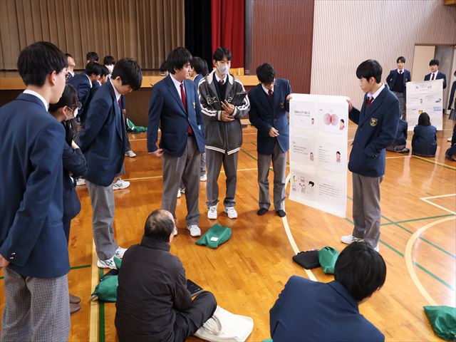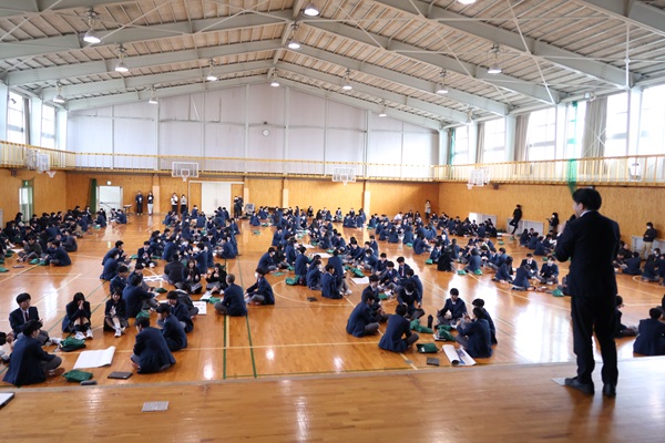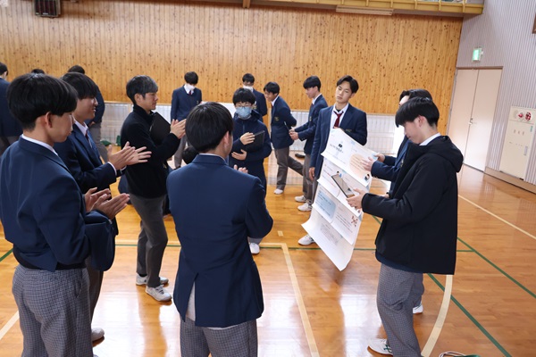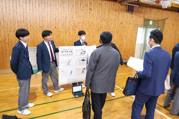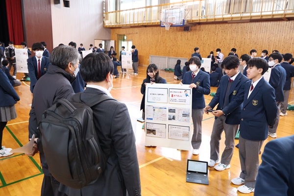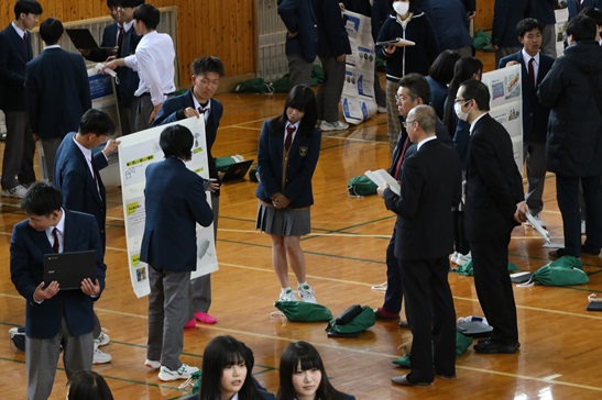 令和8年1月28日(水)5・6時間目は、2学期から「未来に向けてすごいことを創造しよう」というタイトルで取り組んだ探究学習プログラムのポスターセッションを体育館にて行いました。ゲストには、県内外の企業・教育関係の皆様、学校運営協議会の皆様、総勢21名の方々が来校してくださいました。また、授業の空いている先生方も大勢見学に来てくれたおかげで、生徒の熱量とあいまって体育館は熱気に包まれました。