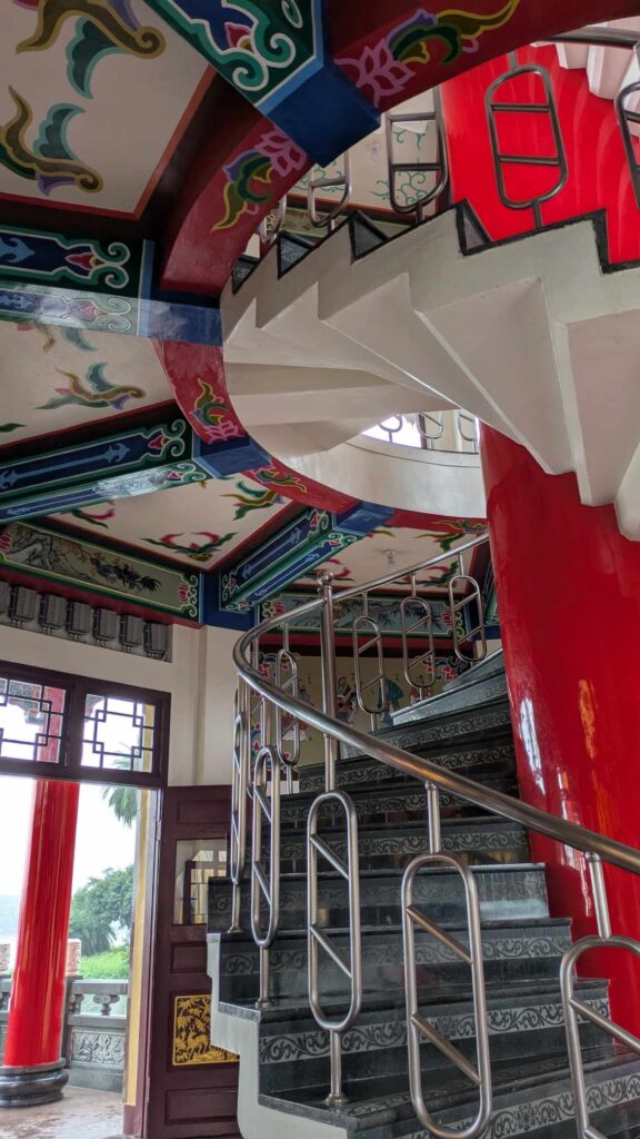龍の口から入り、虎の口から出ます。孔子にまつわる廟で生徒たちは、内部の螺旋階段や彫刻、カラフルな装飾に釘付けでした!