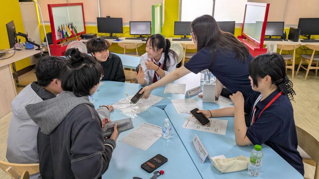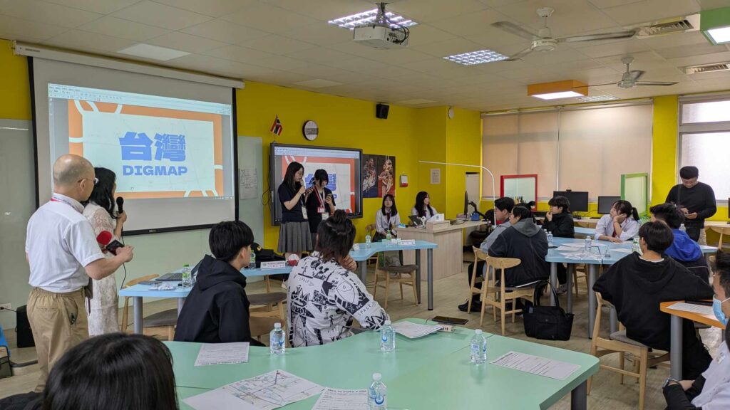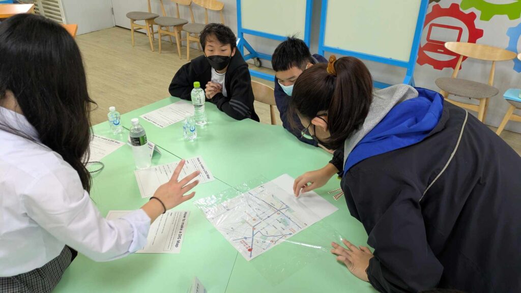 生徒たちは、台湾岡工生と4つのグループに分かれ、それぞれが「水害が起きそうな水路や川」「警察署や消防署」「学校や公園」など、役割を分担し、GoogleMAPを参考に、シールやペンでマークをしました。