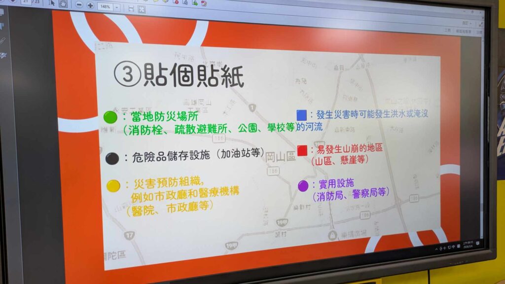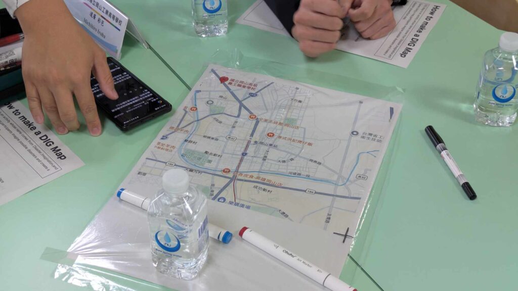 今回は、高雄の岡山駅周辺を対象にしましたが、このワークショップを通じて実際に2024年に水路の水が、あふれて浸水被害があった事を全員で共有することができたり、ガソリンスタンドや公園など、もしもの時に必要な施設が知れて良かったなどの感想を頂くことができました。