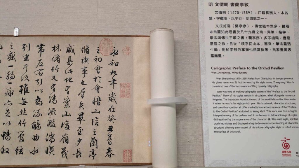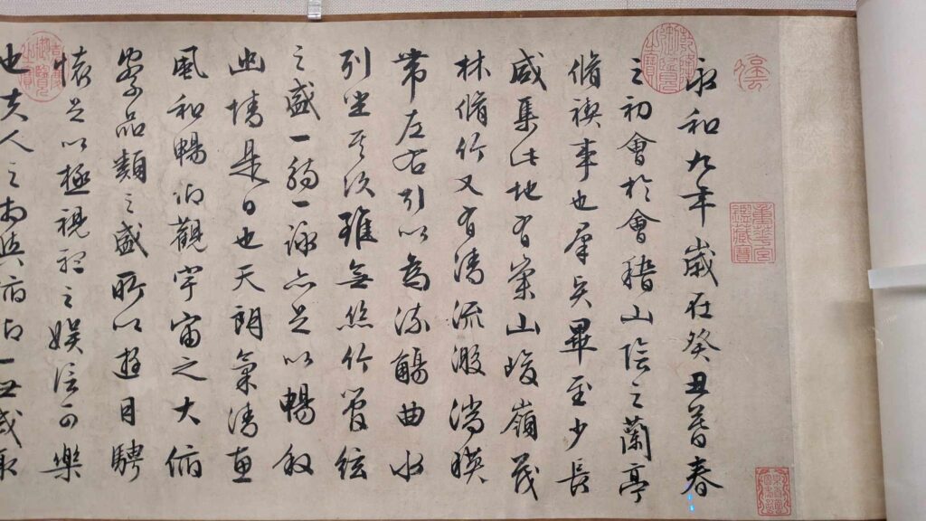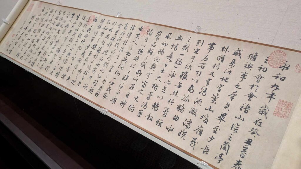 こちらの書は、王羲之(おうぎし)という方が書かれた「天下一品の行書」(複製)で、世界中の書の先生たちが見に来られる一流の書らしいです。日本の書道の先生も見に来られていて、とても感激されていました!本物は王様のお墓に埋葬されています。