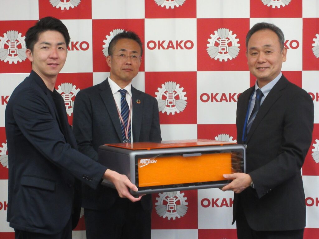 4月2日(木)本校応接室にて、和建設株式会社の中岡様からレーザー彫刻機が河本校長に手渡しされました。
