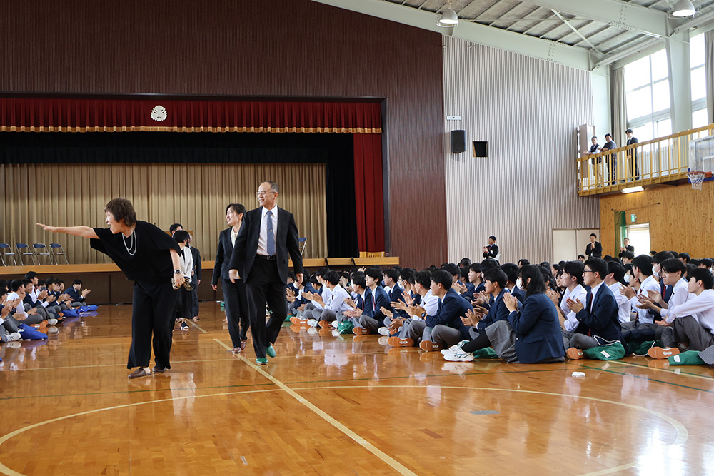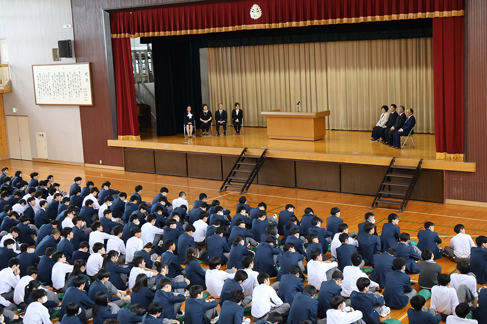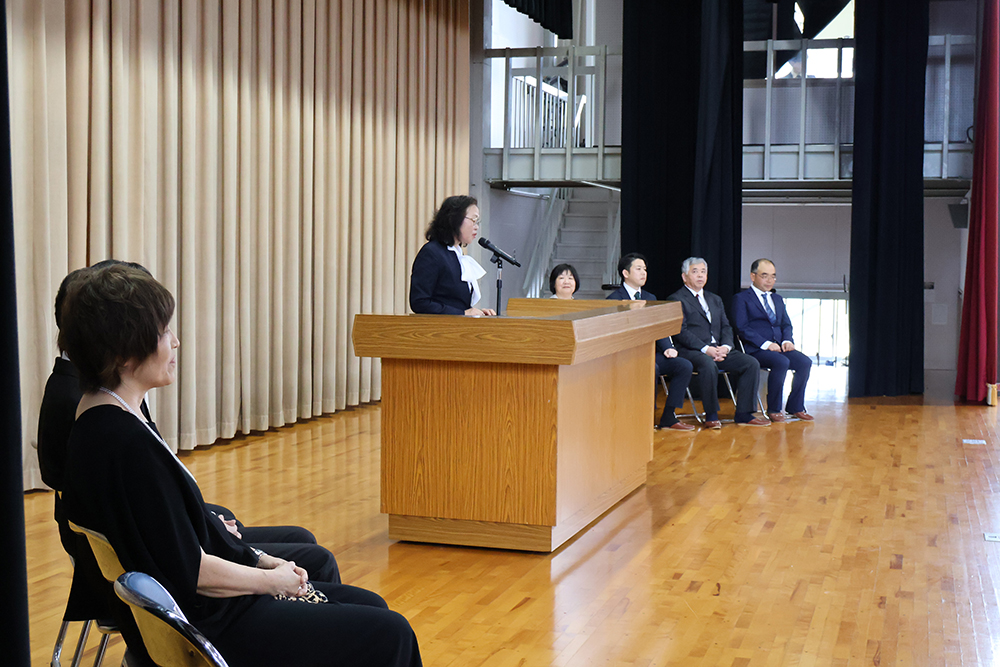 続いて行われた転退任式では、この春に本校を離れられた8名の先生方をお迎えしました。新天地でのお仕事が始まっているお忙しい中、生徒たちのために駆けつけていただき感謝申し上げます。