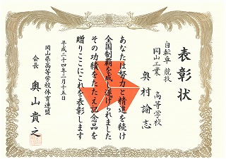 本校自転車競技部から、次の選手・指導者が式典に出席し、表彰状を授与されました。