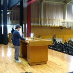 上村さんは、生徒の声が学校生活に反映される仕組み作りとエコキャップ運動の発展、中島君は部活動のいっそうの活発化、また片山君はあいさつ運動と校内の美化を訴えました。